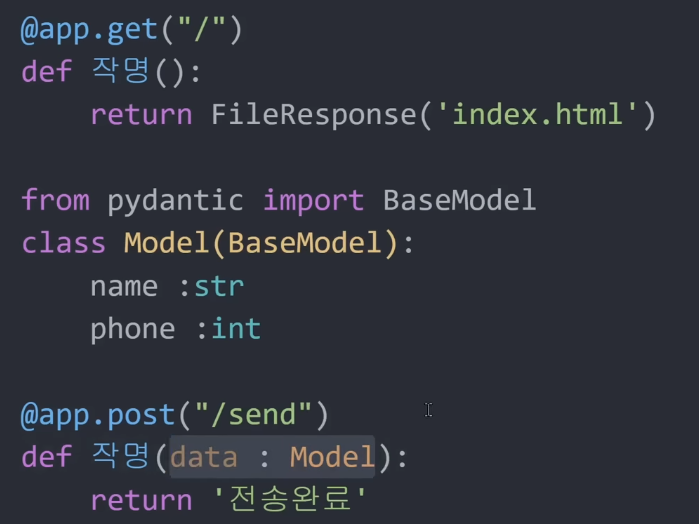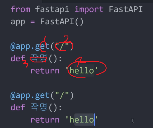 FastAPI사용법은 정말 간단하다. 아래와 같은 형식을 그냥 템플릿 기억하듯 기억하고 1~4만 변경해 주면 끝이다.
