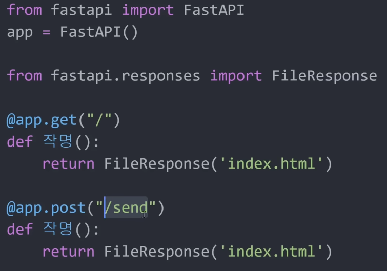 get요청으로 어떠한 페이지를 받고 싶을 때는 FileResponse를 import 해준다. (또한 파이썬은 이와 같이 import를 먼저 적는게 아니라 from 부터 적는다)