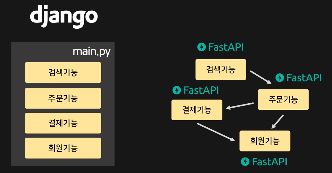 아래 그림과 같이 서버를 작은 기능단위로 분할하여 만든것이 Fast API의 특징이다.