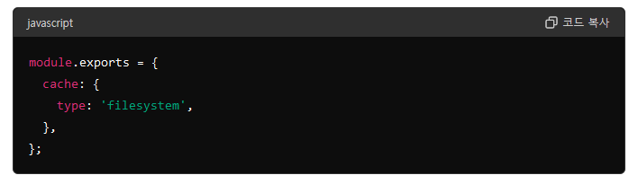 - 웹팩 캐싱을 설정하여 빌드 속도를 높일 수 있습니다. cache 옵션을 사용하여 로컬 파일 시스템 캐시를 활성화합니다.
