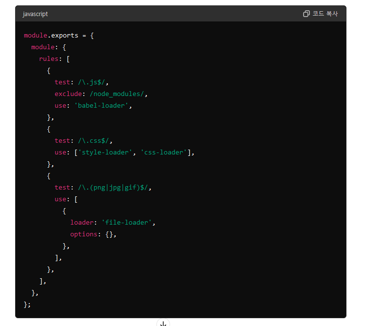 - 각 파일 타입에 맞는 로더가 제대로 설정되었는지 확인합니다. 예를 들어, JavaScript는 babel-loader, CSS는 css-loader, 이미지 파일은 file-loader 등을 사용합니다.