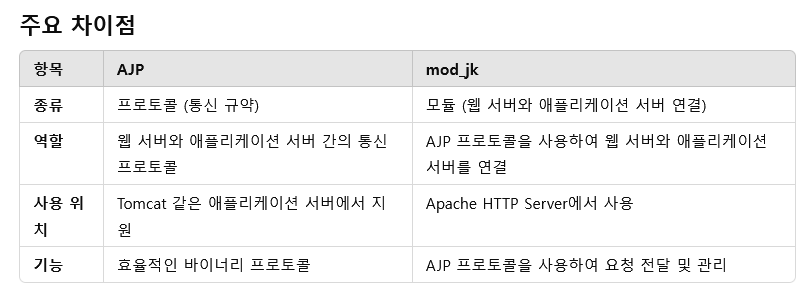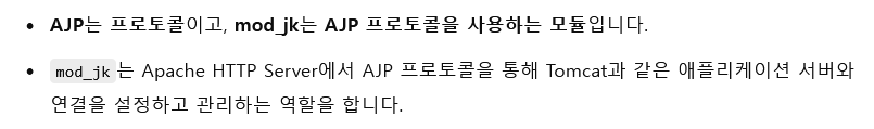 - 모듈: mod_jk는 Apache HTTP Server에서 사용되는 모듈로, AJP 프로토콜을 이용하여 Apache HTTP Server와 Apache Tomcat 같은 애플리케이션 서버 간의 통신을 처리합니다. 즉, mod_jk는 AJP 프로토콜을 통해 웹 서버와 애플리케이션 서버 간의 연결을 설정하고 관리하는 역할을 합니다.