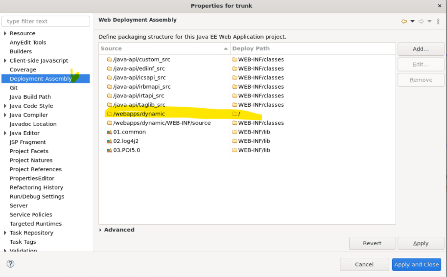 이것이 바로 특정위치(trunk)를 context홈으로 지정해 주는 설정이다. 즉 trunk는 context홈 이자 프로젝트 이름인 것이다. 또한 이클립스의 설정상 다음과 같은 화면을 프로젝트 이름의 오른쪽 마우스 누르고 properties로 가면 띄울 수 있는데,