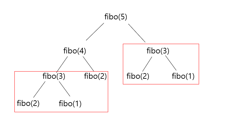 fibo(5)를 구할 때 위와 같은 과정을 거쳐 구하게 된다. 그림을 보면 fibo(1), fibo(2), fibo(3) 연산이 중복되는 것을 볼 수 있다. 만약 fibo(1), fibo(2), fibo(3) 연산의 값을 어딘가에 저장해 놓는다면, 중복해서 연산하지 않아도 될 것이다.