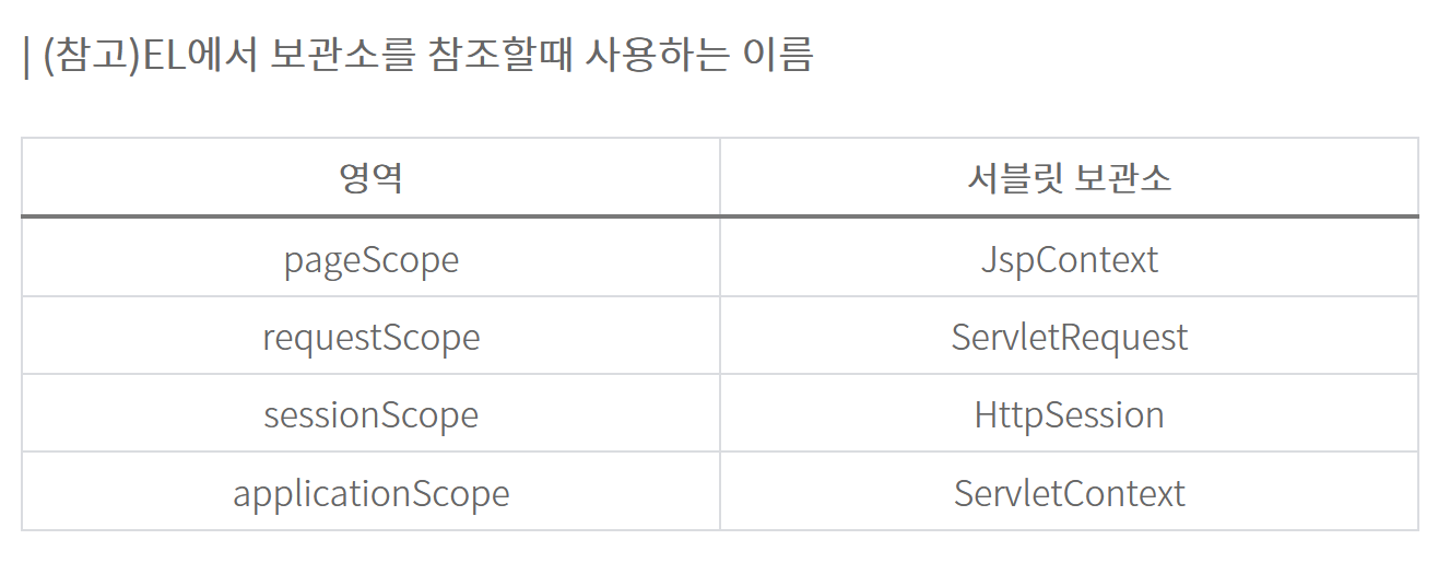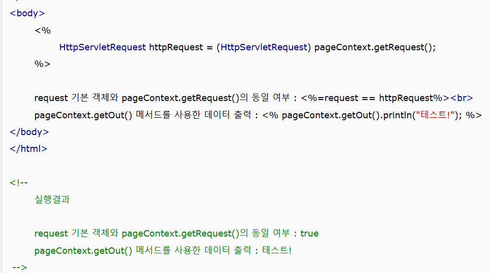 내 정리: pageContext, request, session, application 이러한 객체는 기존에 서블릿에서 사용되었던 객체이다. 이러한 객체가 따로 선언없이도 JSP파일에서 자연스럽게 쓰일수 있다는 것이다.