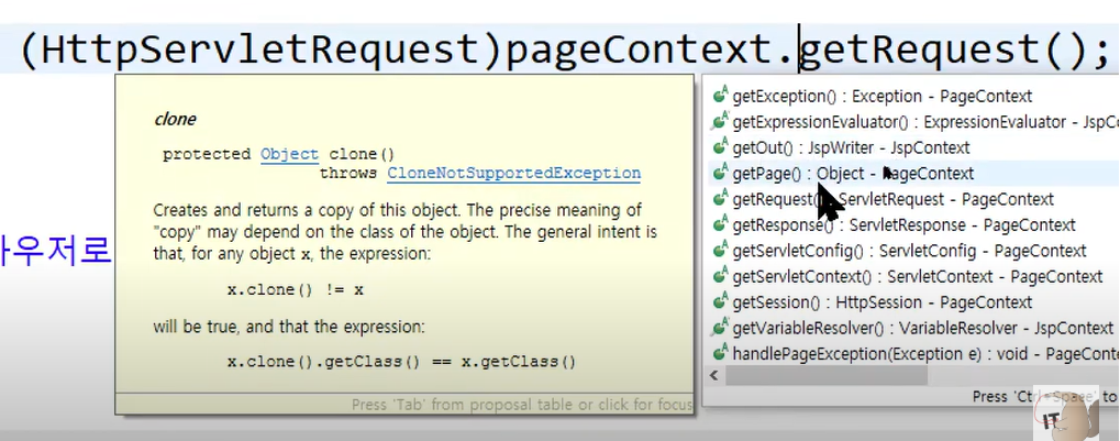 pageContext객체: 기본객체들에 대한 접근을 가능하게 해주는 객체. 아래 그림과 같이 ServletResponse, ServletRequest와 같은 객체들을 반환받을 수 있는 메서드를 제공한다.ex) pageContext.getRequest()
