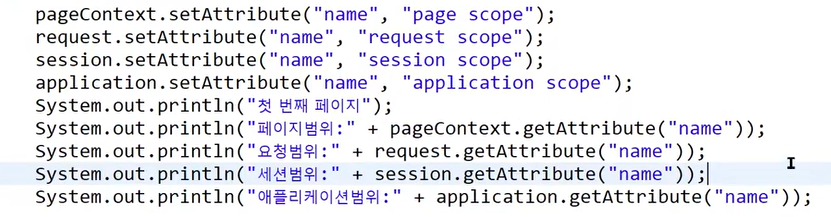 pageContext, request, session, application 이 4가지 객체가 각각 언제까지 유지되는가를 파악하는 것이 중요하다. (https://www.youtube.com/watch?v=e9V6J4Lu3p8&t=412s 영상 약 30분부터)