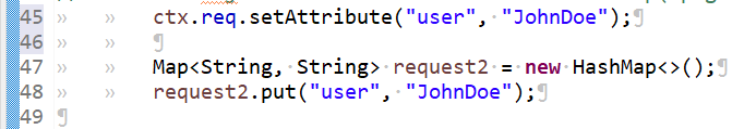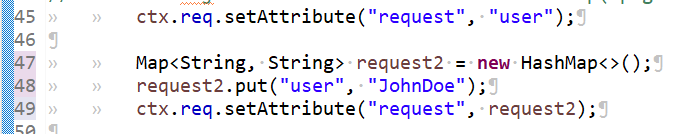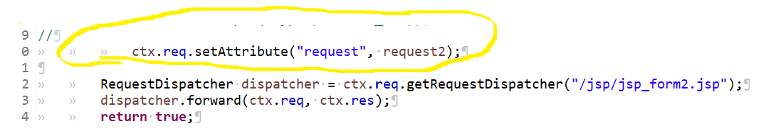 여기서 잠깐 왜 ContainsTag 커스텀 태그에서는 서블릿에서 데이터를 보낼 때 아래 그림과 같은 setAttribute형식(45라인)이 아닌 맵을 통해 데이터를 put(47,48라인)해야만 하는 것인가? ==>> 그럴 필요없다!! 맵이 아닌 setAttribute형식을 사용하더라도 보내는 데이터의 이름을 "request"로 하면 JSP쪽에서는 정상적으로 읽을 수 있다.