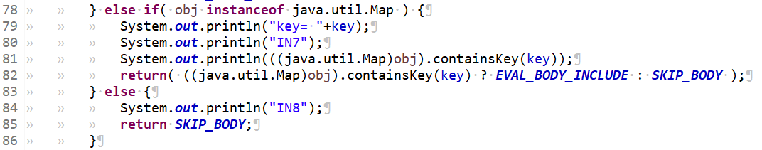 다만!!! ContainsTag커스텀 태그 클래스를 보면 아래와 같은 코드가 나오는데 servlet으로 부터 전송받은 데이터가 단순 값이 아닌 맵 형태의 데이터여야만 78라인으로 들어가고 그후 Servlet으로 부터 받은 맵데이터중 JSP에서 제공된 key와 같은 key가 있는지를 살피게 된다. 만약 있다면 82라인에서 보듯이 true가 되어 EVAL_BODY_INCLUDE. 즉, 커스텀 태그안의 body부분인