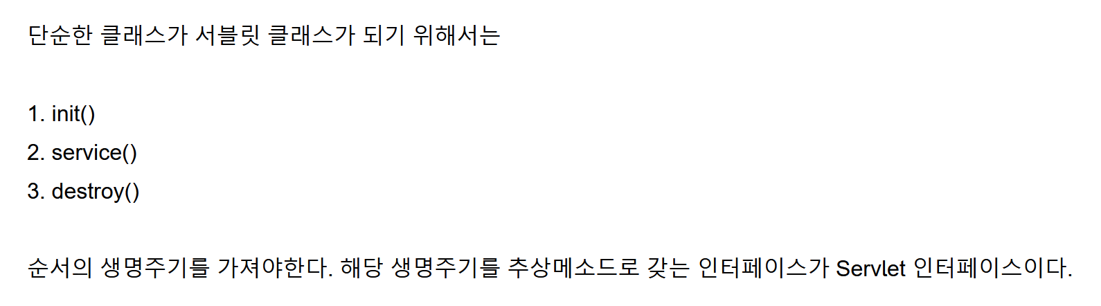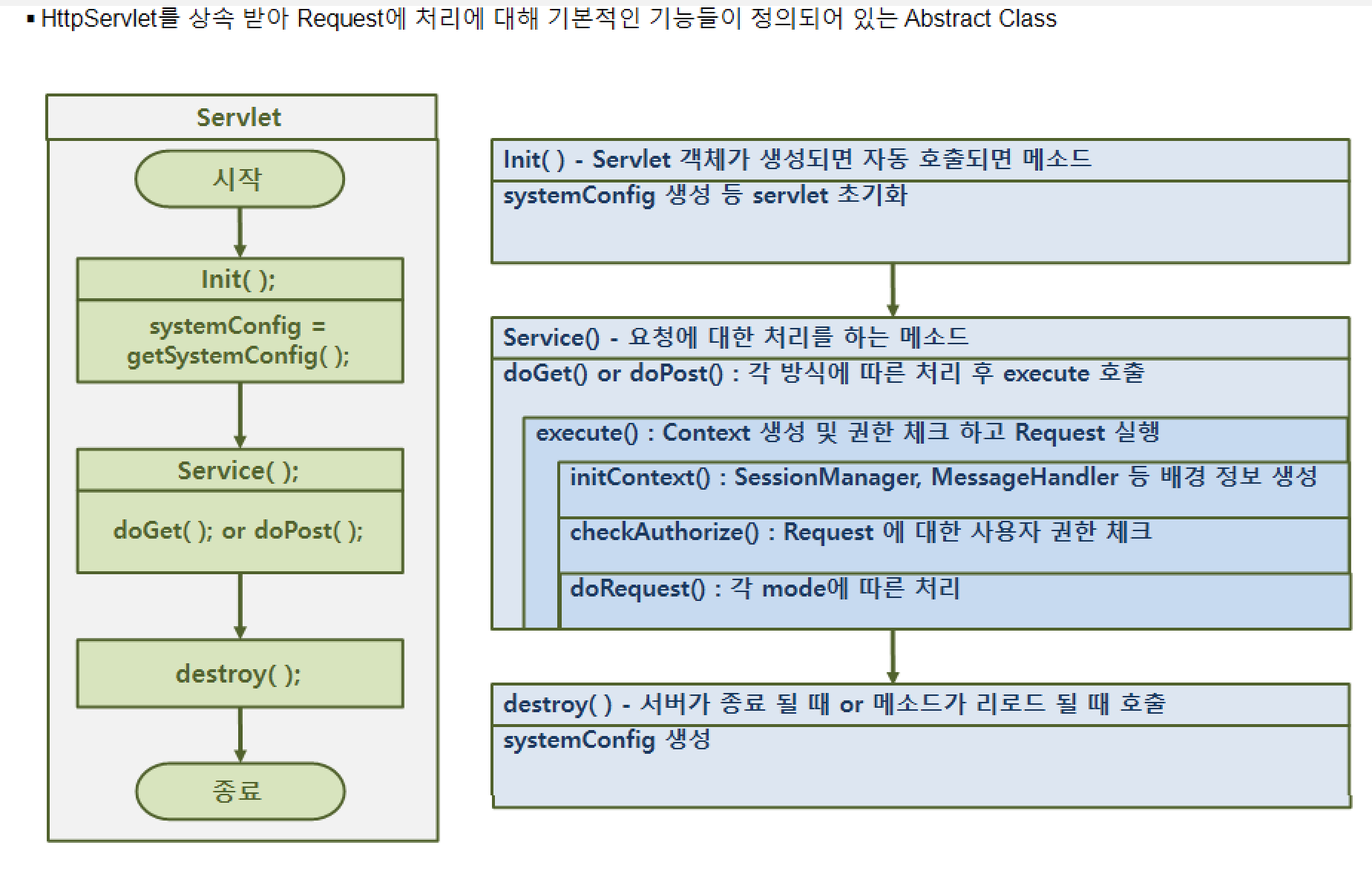 init() = Servlet객체가 생성되면 자동으로 호출되는 메서드 =>> service()(요청에 대한 처리를 하는 메서드) ==>> (클라이언트측으로부터의 요청이 get방식일때 Servlet Container가 호출하는 함수)doget => execute