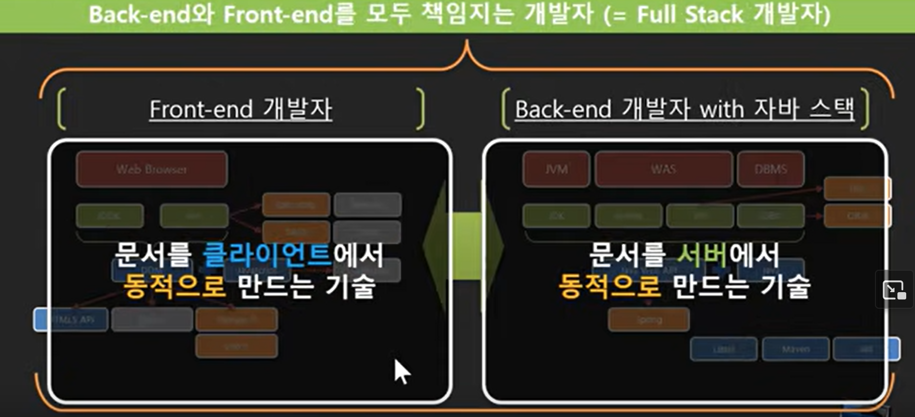 여기서 오해하지 말하야 할것이 Front-end쪽에서 만드는 동적인 문서는 DOM을 조작한다는 의미이고 Back-end쪽에서 만드는 동적인 문서는 클라이언트가 서버로 요청시 보내는 파라미터에 따라 백엔드가 응답으로 반응하는 리소스(HTML, JSON, ...)의 내용이 달라진다는 의미이다. 즉 말은 모두 "동적"이라고 하고 있지만 무엇이 동적인가는 지극히 다른것이다.