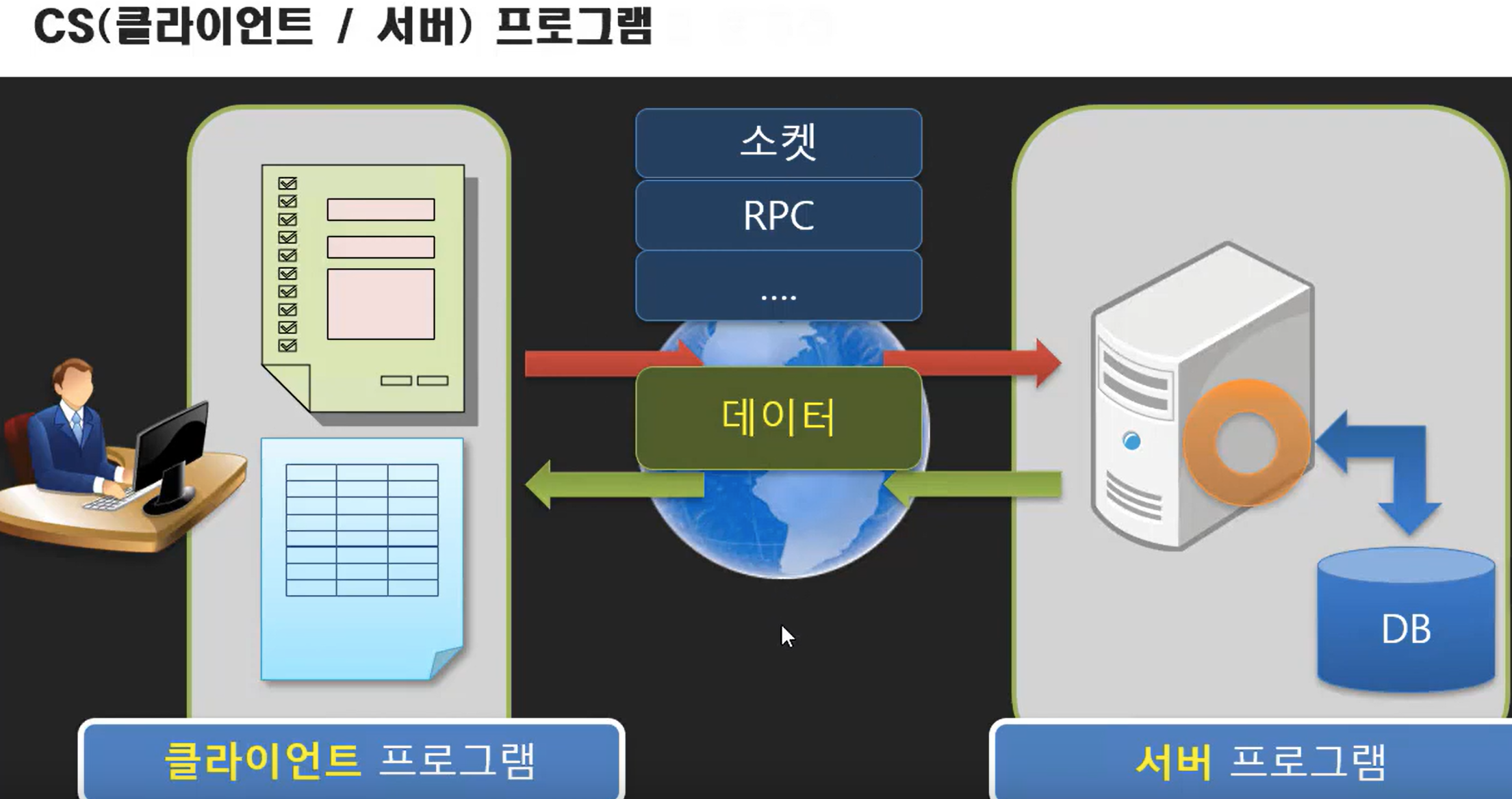 클라이언트-서버 프로그램이 곧 웹프로그램이 아니다. 과거에는 아래 그림과 같이 클라이언트와 서버가 통신하면서 굳이 웹이 아닌 네트워크인 소켓, RPC 등을 사용하여 client와 server가 통신했다. 이렇게 되면 서버측의 프로그램을 수정했을때 클라이언트측에서 프로그램을 재설치(업데이트)하고 Client와 server간의 데이터가 수시로 전송되어야 하는 필요가 발생하는데 이러한 요구(네트워크를 사용하여 데이터를 전송하고 클라이언트 측의 프로그램을 업데이트, 재설치해야 하는 요구)를 충족시켜 주는 것이 웹프로그램인 것이었다(이런 맥락에서 위에서 CS프로그램이 곧 웹 프로그램이 아니었다고 말한것이다). 웹으로 오면서 클라이언트 프로그램이 사라지게 된 것이다(왜냐하면 모든 페이지는 백단에서 동적으로 만들고 그것을 웹을 통해 브라우저에 전송만 해주면 되고 브라우저는 그것을 단순히 보여주기만 하면 되므로. 하지만 자바스크립트가 사용되면서 다시 브라우저단에서 서버로 페이지가 아닌 데이터를 요청하게 되는 윈도우즈 프로그램이 프론트 단에 생기게 되면서 클라이언트에서 문서를 동적으로 만드는 기술을 다루는 프론트앤드개발자가 생겨난 것이다.(기존의 클라이언트와 구분해 주기 위해 프론트앤드 개발자라는 용어를 사용함)