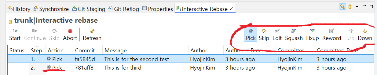 pick = 커밋을 유지, skip = 해당 커밋을 삭제함(이렇게 기존의 커밋을 삭제하는 것이다), Squash=여러커밋을 하나로 합침, edit = 커밋메시지를 수정할 수 있음