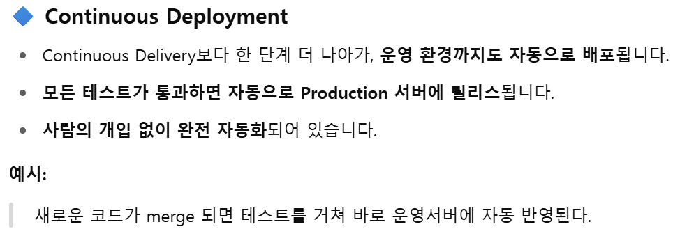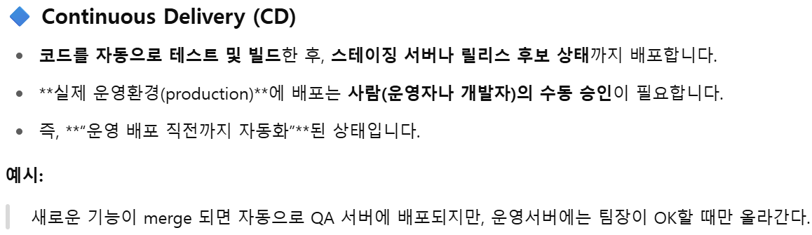 회사에 따라서 수동적으로 배포하는 곳이 있고 자동으로 배포하는 곳이 있다. 얼마만큼 자신이 있느냐에 따라 나뉨. 회사마다 어느정도의, 얼마만큼의 자동화를 하는지가 다 다르다. 따라서 CI/CD라고 하여 모든 회사가 같은 프로세스를 거치는 것이 아니다.