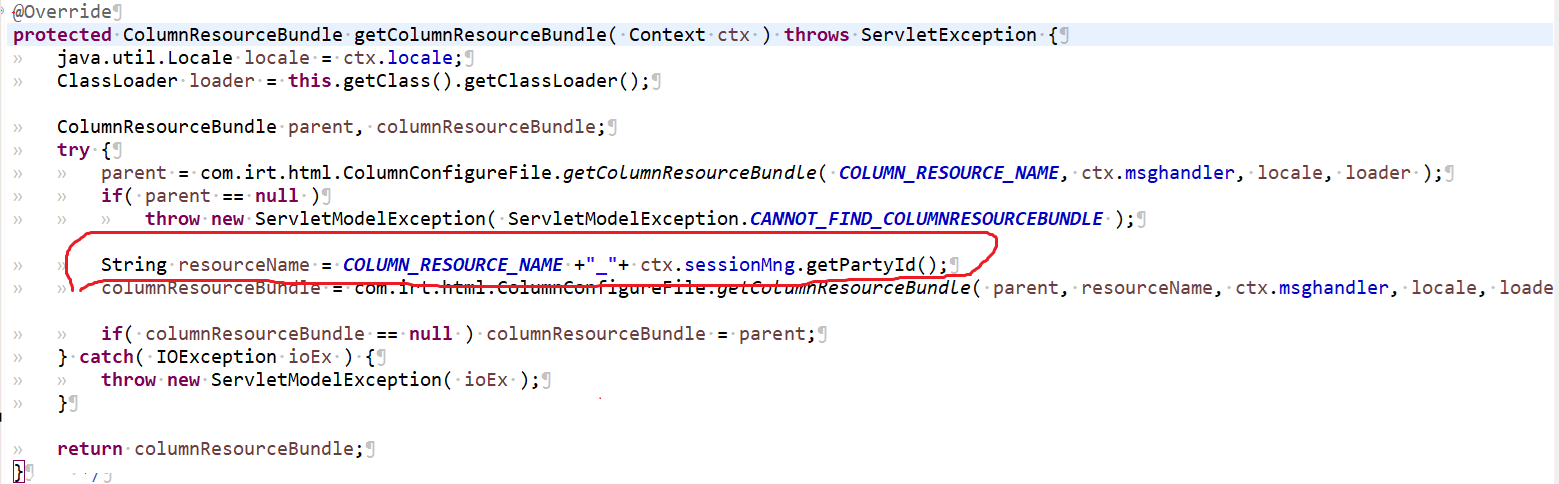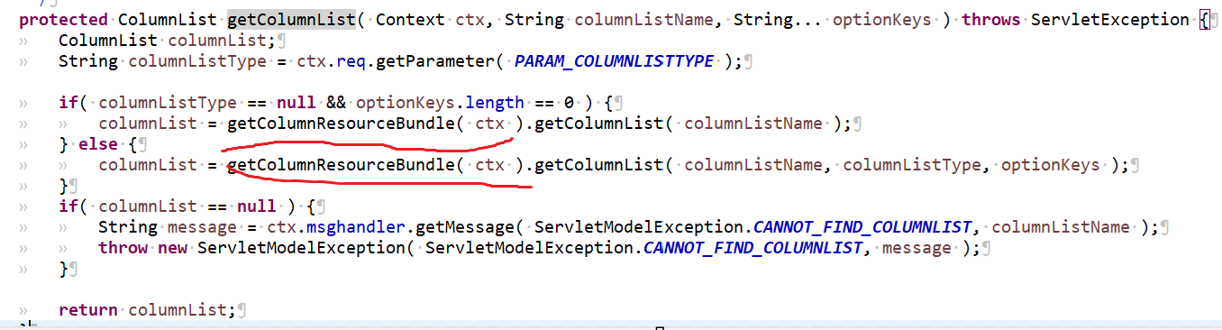 함수를 보면 getColumnResourceBundle()이라는 함수가 있고 그 뒤에 getColumnList()함수라고 하여 인자로 받은 columnListName를 참조하여 특정 컬럼리스트를 가리키게 된다. 눈치 긁어보면 getColumnResourceBundle() 이라는 함수가 곧 특정 columnResouce파일을 특정한다는 것을 알수 있다.