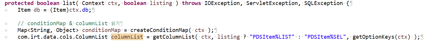 내가 궁금했던 것은 어떻게 이런 mesg폴더안에서 컬럼리스트를 가져 오기 위해서 특정 columnResource파일을 특정할 수 있는가가 의문이었다(columnResource파일안에 여러 columnList들이 있으므로). 정답부터 말하자면 그 답은 Servlet파일에 있는 getColumnList() 함수에 있다(아래는 PDSItem.java 서블릿 파일에 있는 list()함수안의 getColumnList()함수이다.
