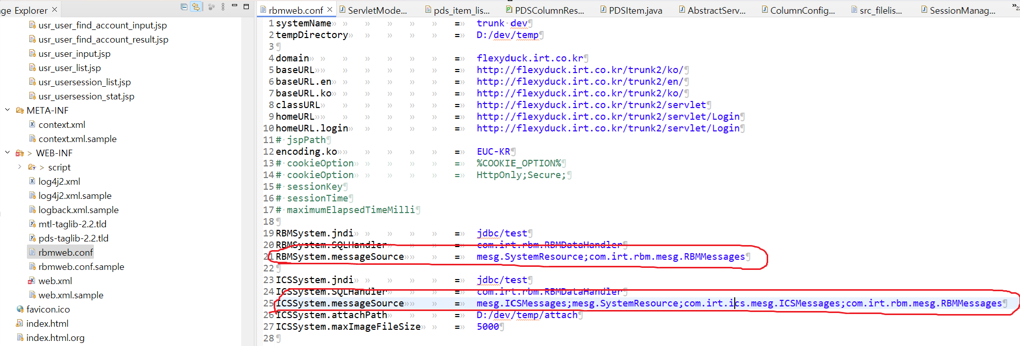 (참고로 rbmweb.conf라는 파일을 보면 아래와 같은 코드를 볼수 있는데 파일 확장자 자체가 설정(conf)파일이므로 어떤 Messages를 참조하도록 설정되어 있는지 알수 있다. ColumnResouce에 관한 언급은 없다)