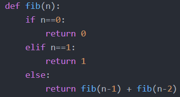 왼쪽은 피보나치 수열을 계산하는 파이썬 함수이다. 피보나치 수열을 구하는 문제는 재귀함수를 이용하는 대표적인 문제로 잘 알려져 있다. 여기서도 재귀를 사용해서 가장 기본적인 방법으로 구현했다.