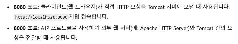 Tomcat 서버에서 포트 8080과 8009는 각각 다른 용도로 사용됩니다. 이 두 포트는 각각 HTTP 요청 처리와 AJP 프로토콜을 처리하는 데 사용됩니다.